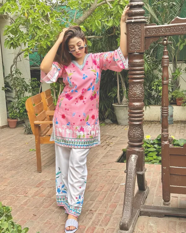 Blush Breeze 2 PC: Fresh and comfortable ready-to-wear 2-piece set in premium silky lawn fabric. Features a chic, short-length (36″) floral print shirt in a delicate pink (blush) shade and a matching flowy plazo (38″-39″). Brand-stitched with professional overlock finishing.
