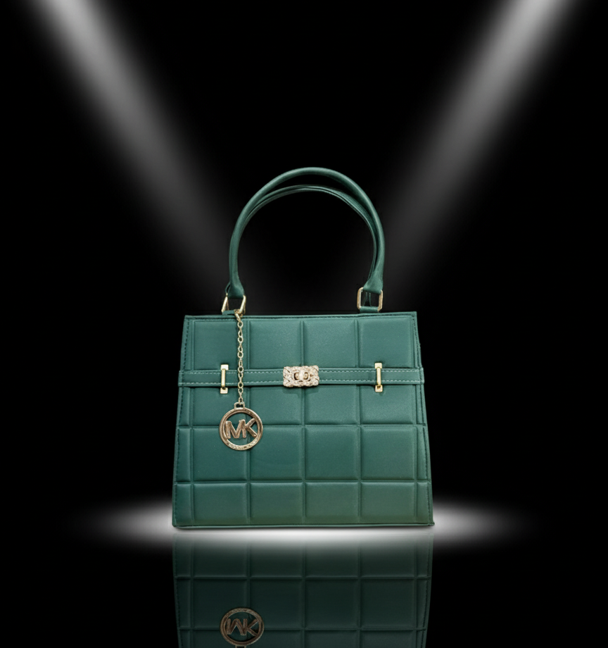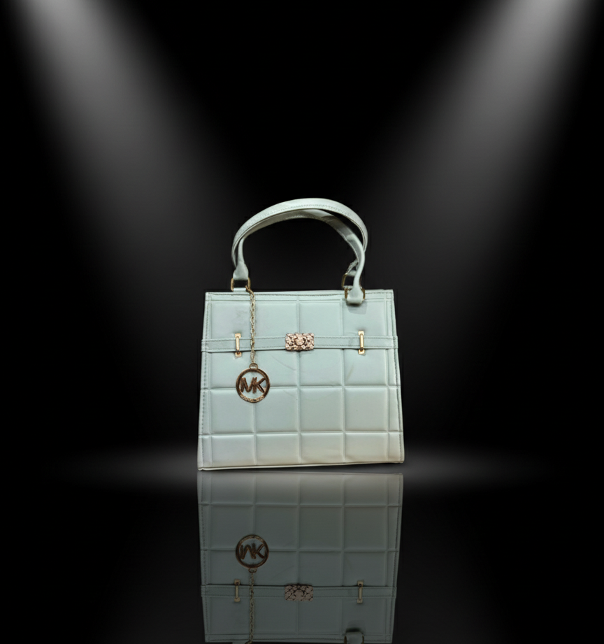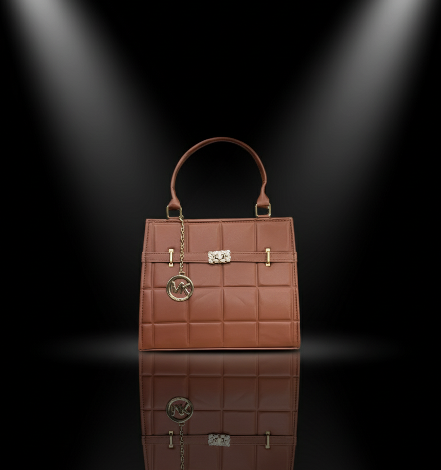 A timeless and elegant designer-inspired top-handle bag in a versatile nude beige/blush color. This structured satchel features a sophisticated quilted faux-leather design, sparkling crystal-accented clasp, and a chic MK-style charm. The perfect neutral accessory for professional environments or elegant everyday wear.