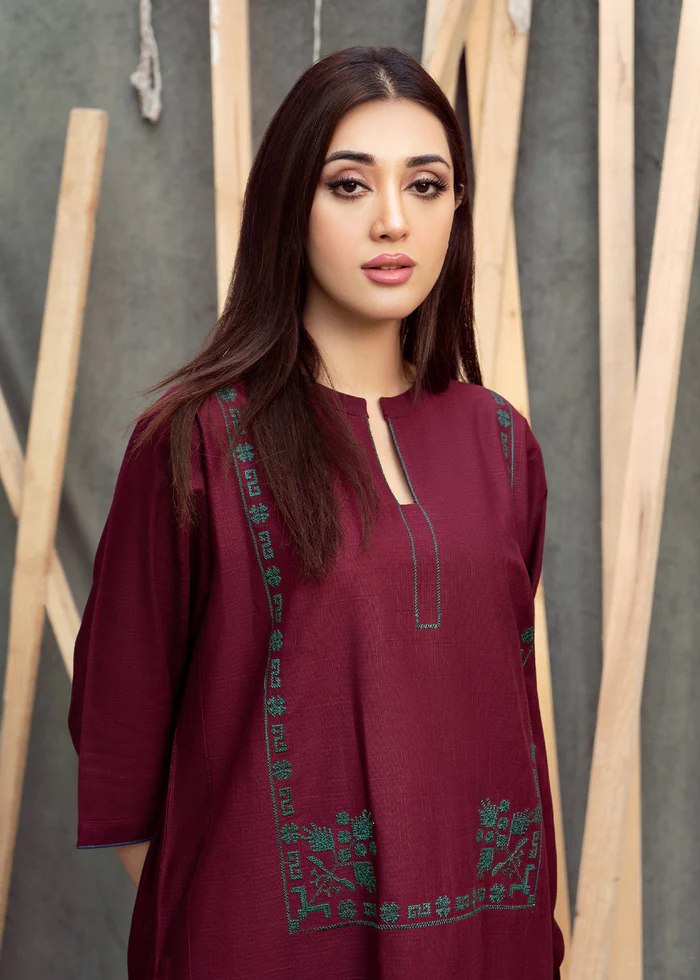 Elevate your wardrobe with this stitched, long-length kurti, crafted from premium linen and adorned with exquisite embroidery. The rich maroon hue and elegant cut make it a versatile piece, perfect for year-round wear, casual outings, or semi-formal gatherings.